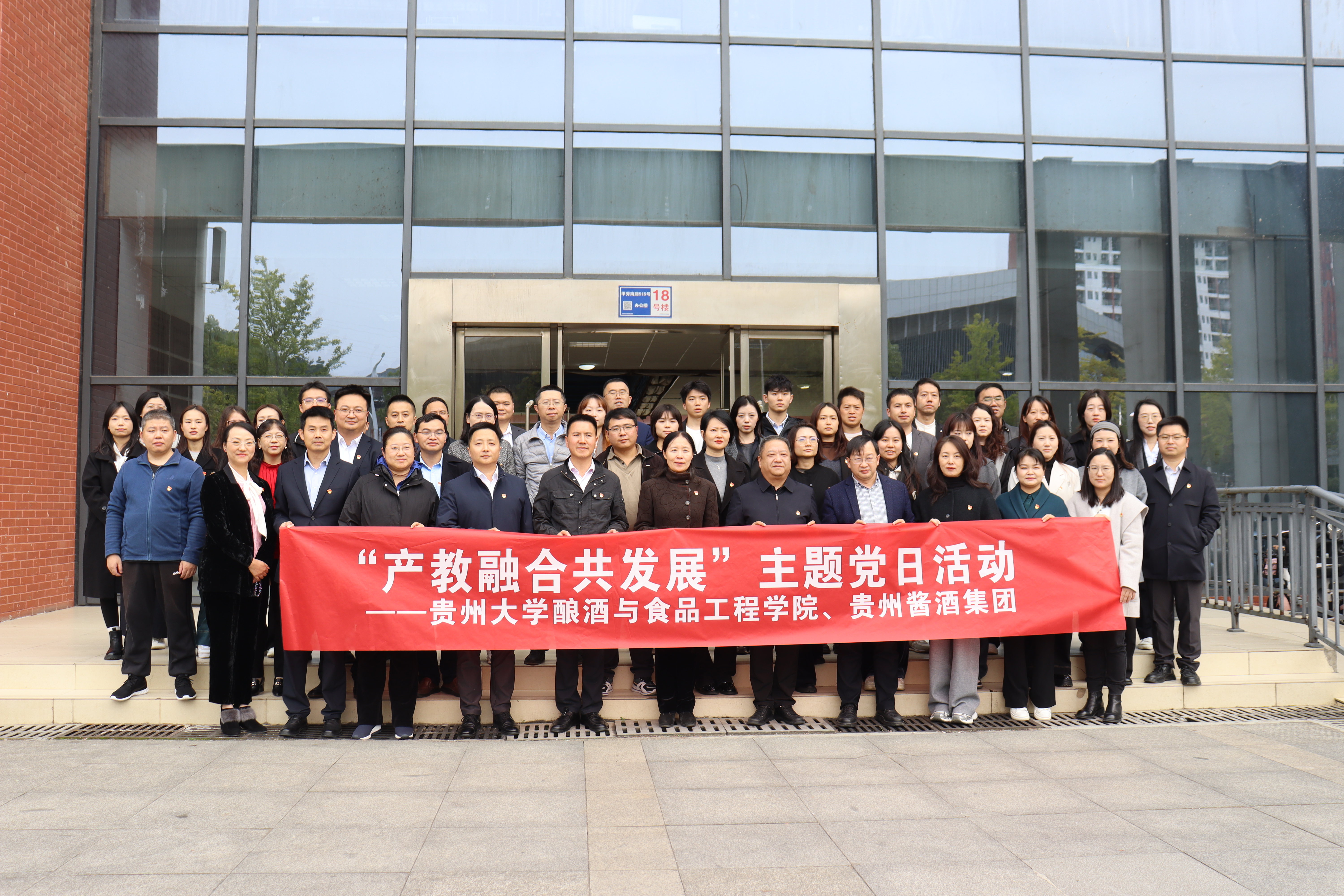 为深入贯彻落实党的教育方针及国家产业发展政策,推进党建工作与产教融合有机融合,促进校企资源共享与优势互补,2025年10月23日,贵州大学酿酒与食品工程学院教职工第一党支部与贵州酱酒集团党委下属党支部联合开展“产教融合共发展”主题党日活动。贵州酱酒集团党委书记、董事长、总经理熊昆,党委委员、纪委书记金浪天,党委委员、副总经理高翔,党委委员、副总经理毛丽琴,财务总监高敏,学院党委书记凌琦,学院党委副书记、院长黄永光,教职工第一党支部书记吴鑫颖,副书记陈星奕,实验中心主任王雪郦及双方党员参加。